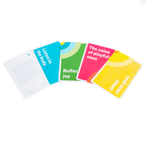 Bring awareness, calm, and balance to your life with this lovely set of easy-to-use mindfulness cards that feature simple, easy-to-implement practices in everyday life. These neat 3-1/2″x5-1/2″, color-coded cards help promote personal reflection, kindness, insight, relaxation, and joy. Each card has an inspiring phrase on the front and a bite-sized mindfulness exercise on the back. Select a single card each morning to form an intention for the day or pull several cards to promote a variety of mindfulness activities throughout the week. Some of our testers shared they loved displaying cards that “spoke to them” or fit their situation – around their homes, offices, clinics, and classrooms. Simple Mindful Practices Cards provide a simple, engaging, nourishing way to cultivate peaceful mindful moments – anytime and anywhere.